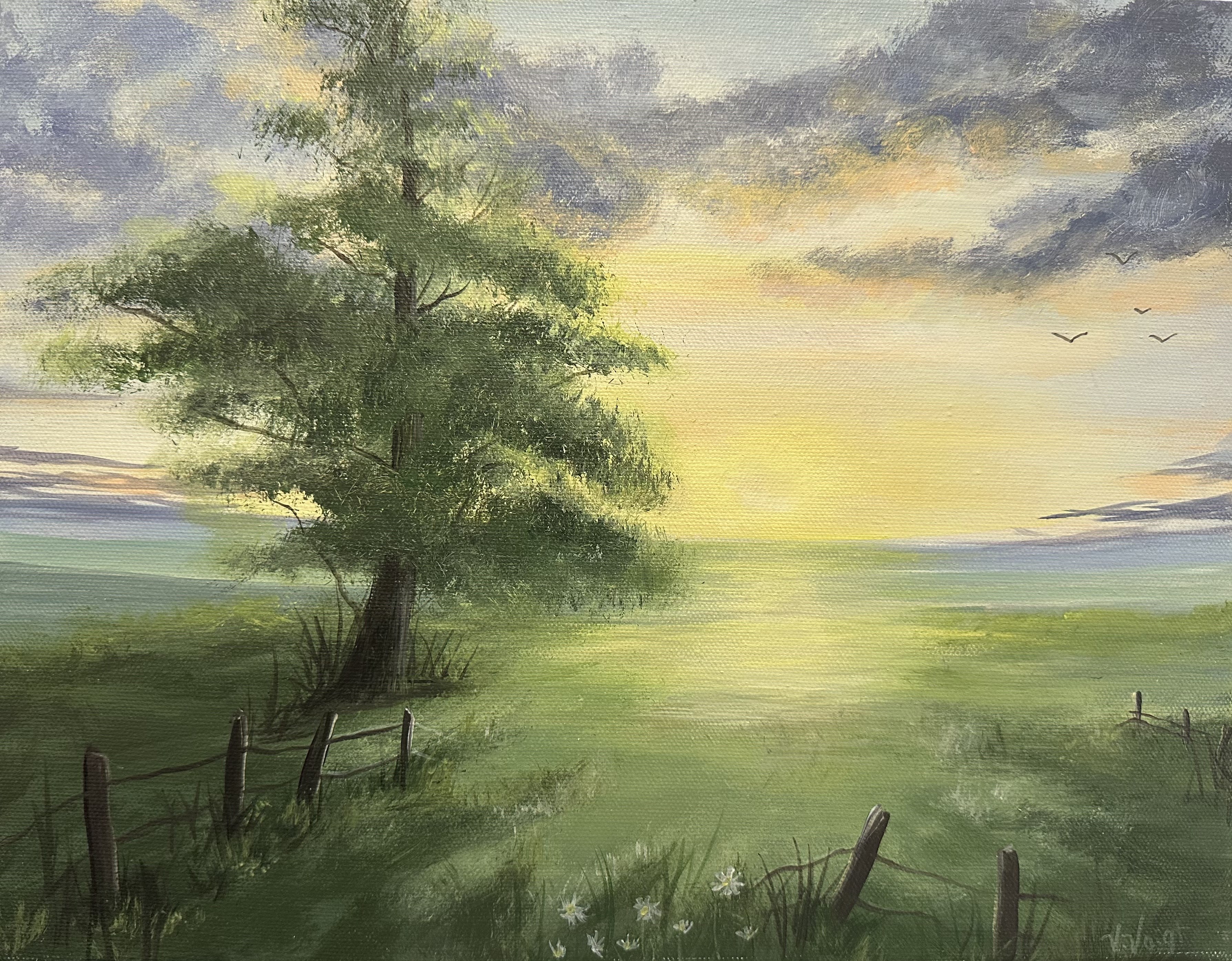 Have fun while learning to paint this 11 x 14 calming Pasture and Sunset landscape with acrylic paint. All supplies are included to complete this painting during the class, brushes to borrow, paints, canvas, apron to wear.